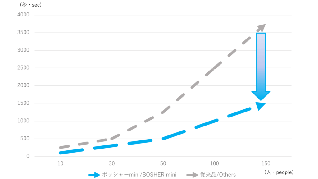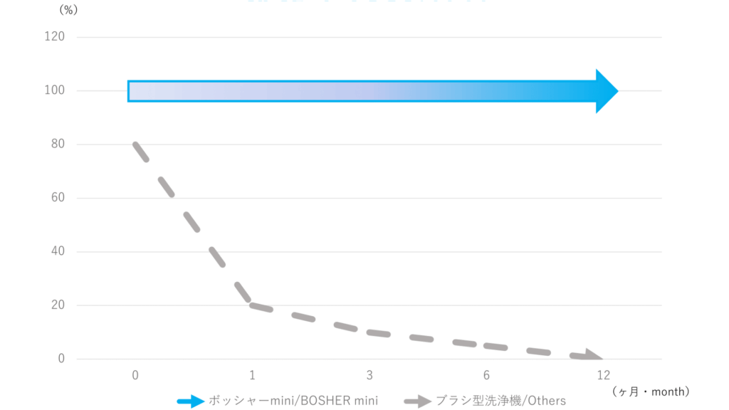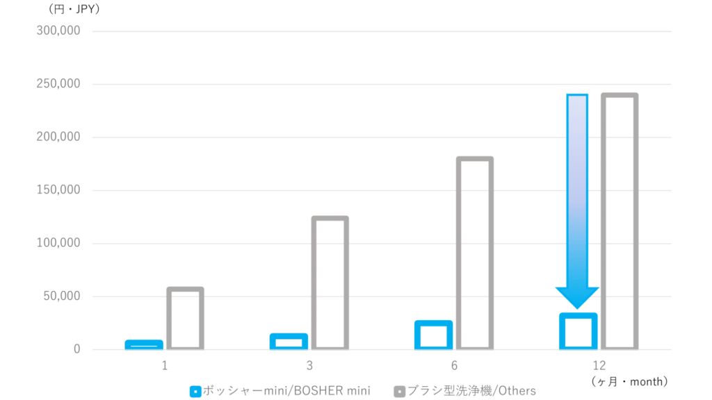 ブラシも電気も使わないボッシャーmIniは、従来品と比べ水道光熱費・消耗品費・清掃人件費等を最大75%圧縮を実現できます。